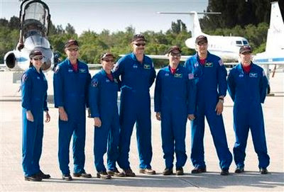 The crew of the space shuttle Atlantis STS-125 (L to R) mission specialist's Megan McArthur, Michael Good, pilot Gregory Johnson, commander Scott Altman, mission specialist's John Grunsfeld, Michael Massimino and Andrew Feustel stand for a group photo after arriving at the shuttle landing facility at Kennedy Space Center in Cape Canaveral, May 8, 2009.
